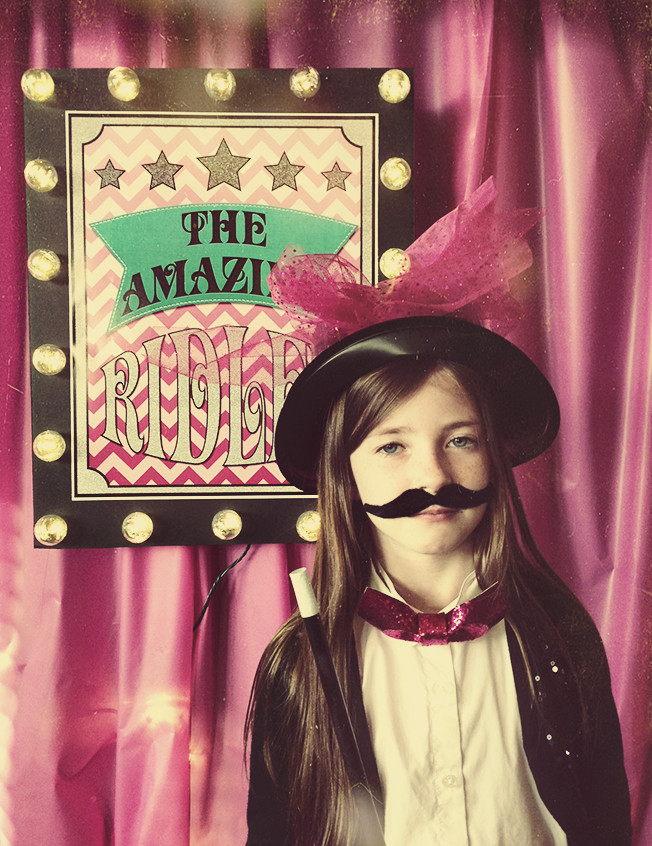 I made two signs introducing our two birthday stars. I had them printed up and then mounted them on black foam core. I cut holes through the foam core and added lights… A magician must have her name in lights!